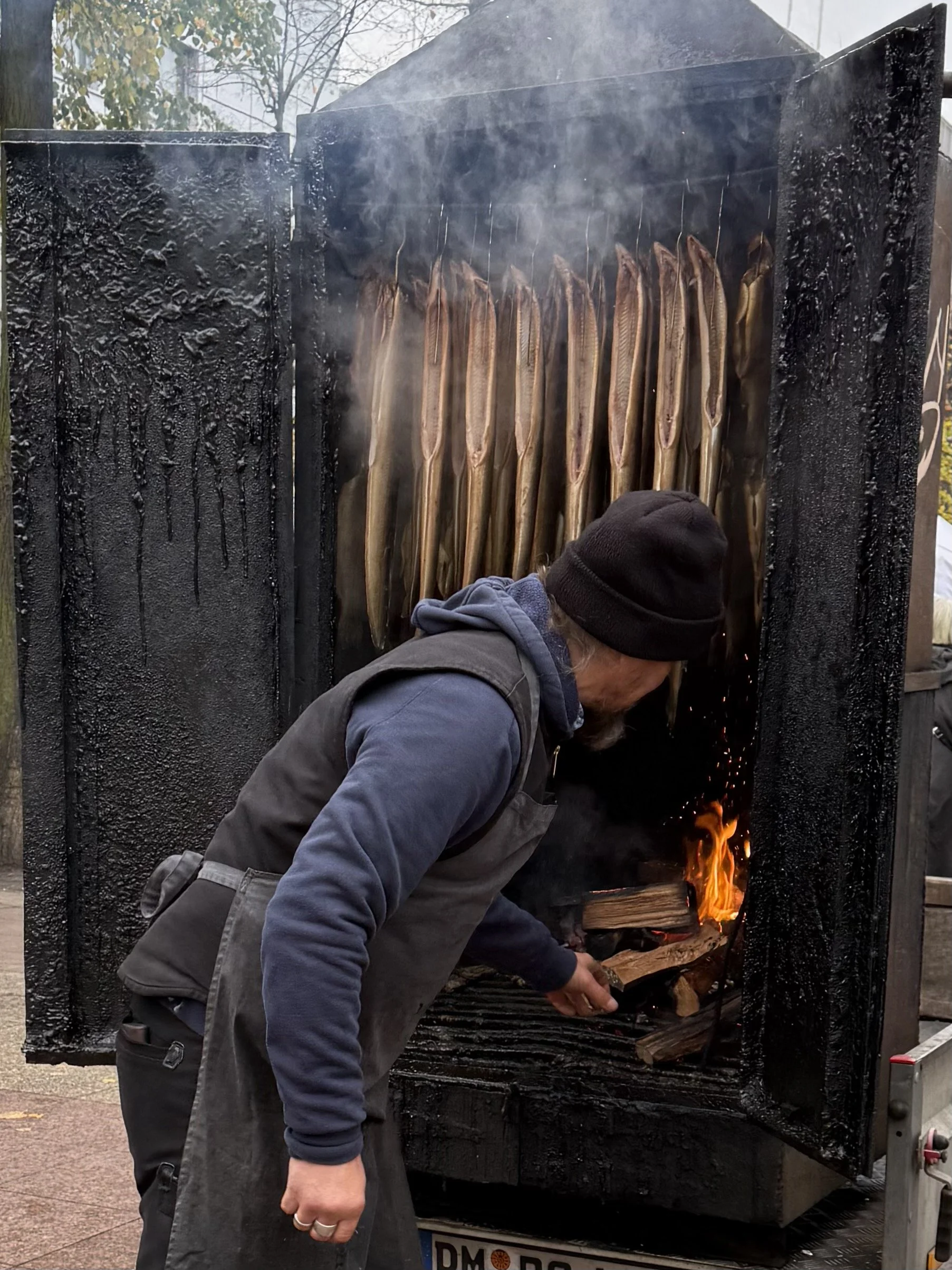 You need fire, freshly caught fish, and a passion for a craft practiced for centuries. Do you have a day of the week you always look forward to? We think Thursday is a great example. It’s not too far from the start of the week and just before the weekend. Plus, it’s the day when you can get fresh, over pinewood smoked fish at Wittenbergplatz in Berlin – from Thomas. An honest fisherman in Red Wing boots, a well-smoked Carhartt vest, and well-worn Japanese raw denims. Everyone knows him, and he knows everyone, packing exactly what his loyal customers need without even asking – and he’s been doing this for over 20 years.