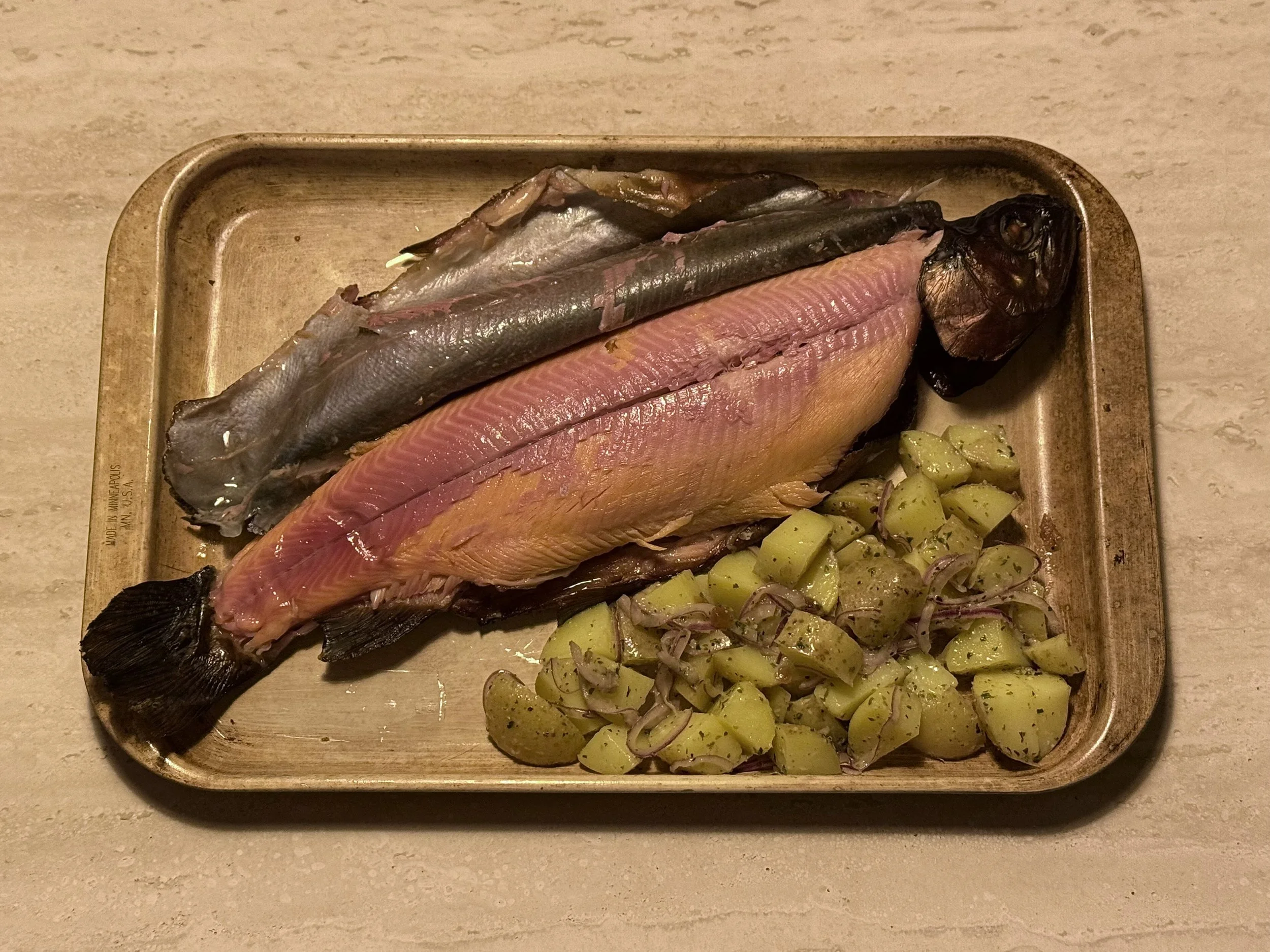 Probably the most well-known smoked fish is a simple trout. If you’re unsure where to start, trout is a great choice. Not too intense, not too fatty, and not too big. As for sides, you can go with whatever you like.