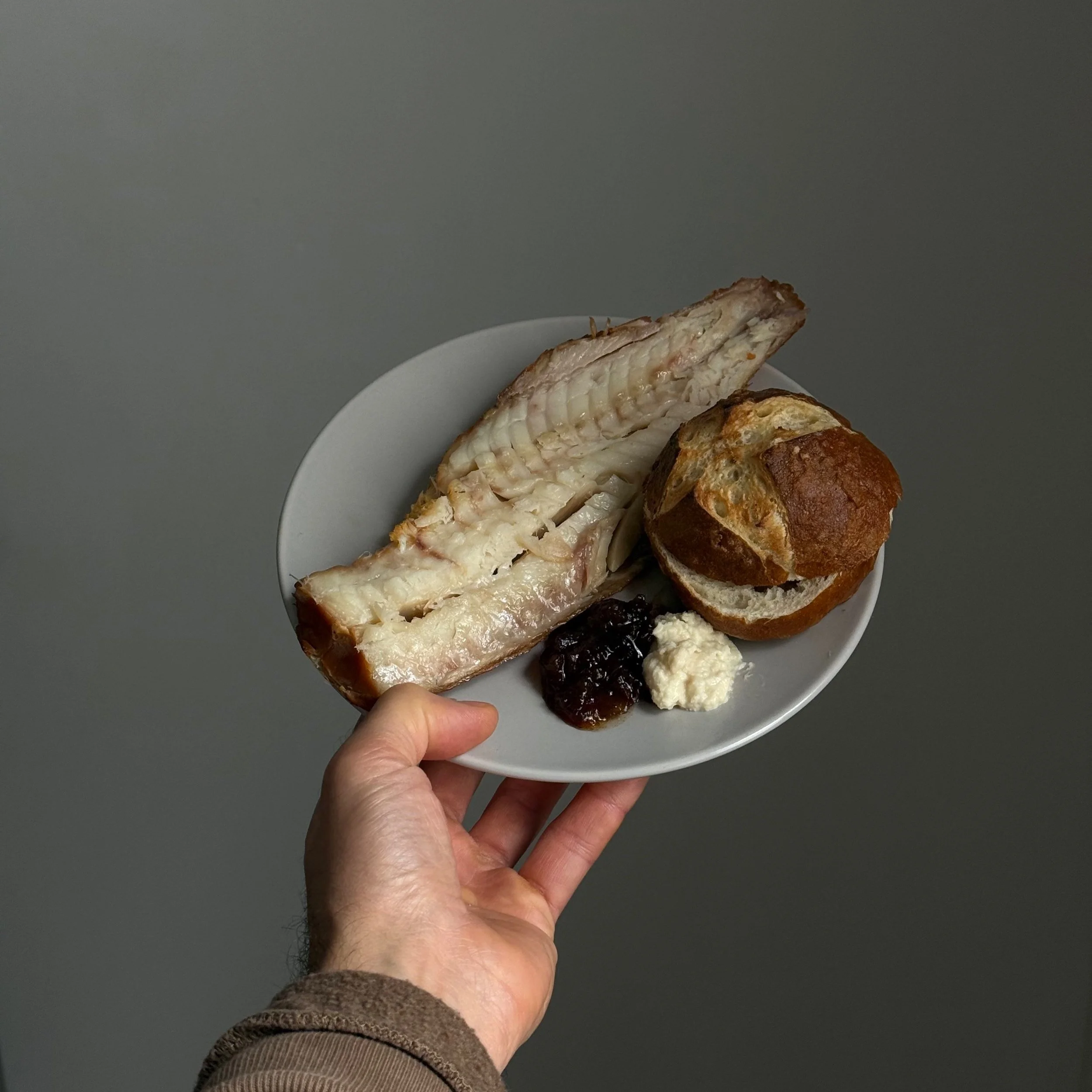 According to Thomas, redfish isn’t very popular, which we can’t understand at all. Redfish has a slightly coarser texture, and the fat that clings to the bones has a buttery flavor. We keep it simple and go for a classic roll—or, even better, a pretzel roll. Here’s where our beloved Cartwright & Butler onion chutney comes into play: we spread it on the bread and then top it with the redfish. For anyone who likes a bit more heat, we definitely recommend adding some spicy horseradish.